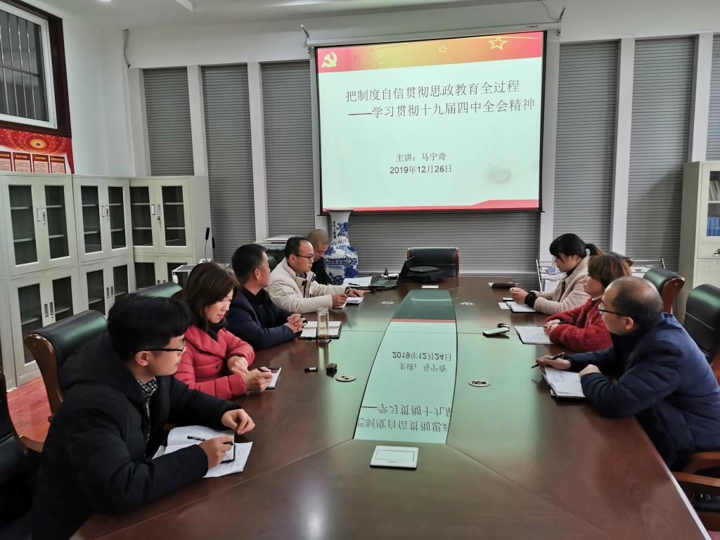 12月26日,beat365中文官网在二号楼A座310室举办学习贯彻十九届四中全会精神专题党课活动。党支部书记马宁奇以《把制度自信贯穿思想政治教育全过程》为题,为全体教职工讲了内容丰富、生动精彩的一课。
