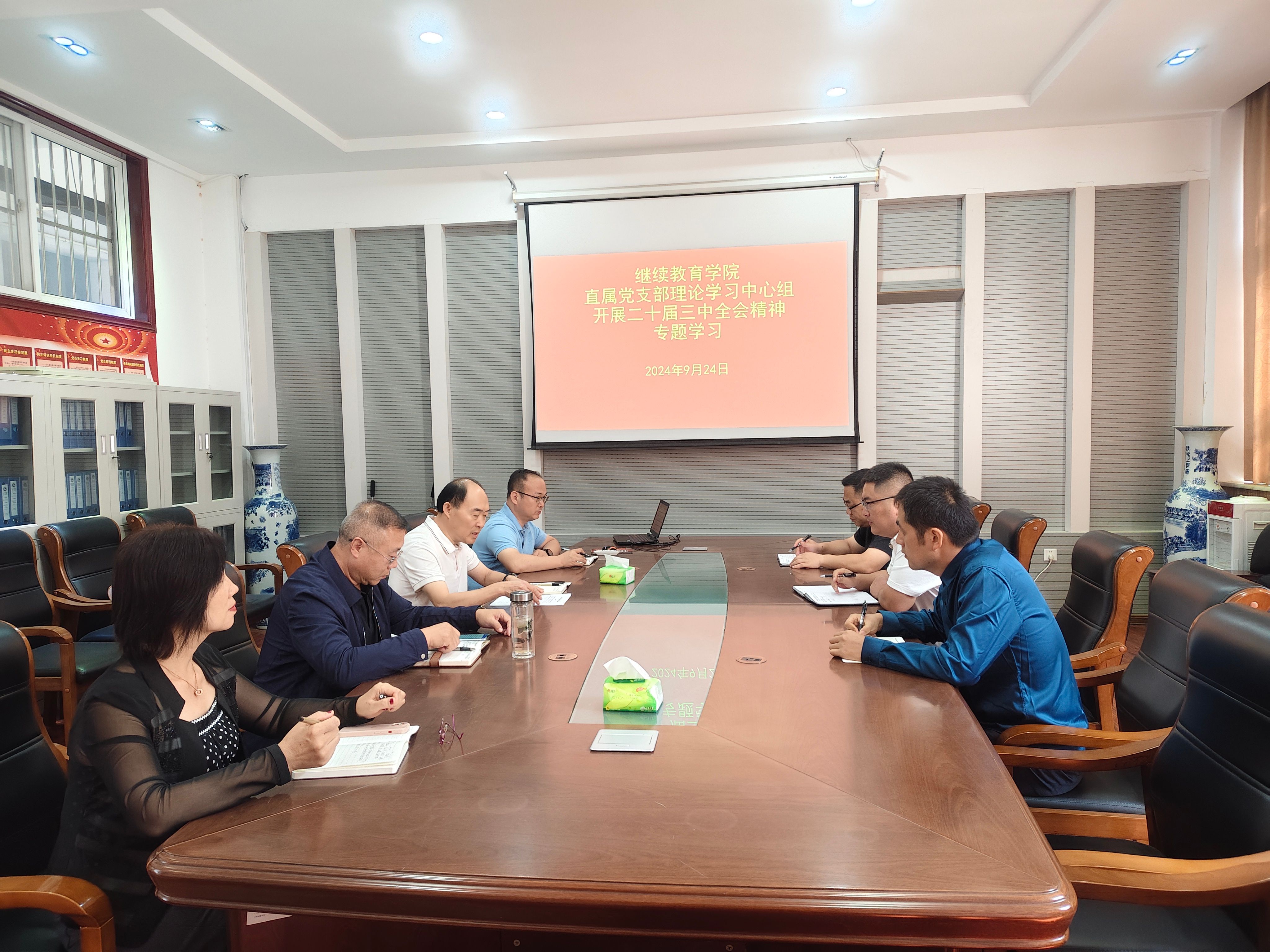 为扎实推进二十届三中全会精神学习宣传贯彻落实工作,引导全体同志把思想和行动统一到全会精神上来,根据公司工作要求,beat365中文官网直属党支部理论学习中心组于2024年9月24日上午开展了二十届三中全会精神专题学习。支部书记殷战稳主持会议并领学,班子成员和科级干部参会。